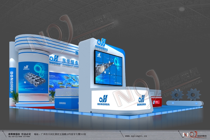 契合東華鏈條的品牌形象和產(chǎn)品特性,采用矩形結(jié)構(gòu),再搭配燈具燈光的效果,襯托出展位高端、時尚的氛圍,突出一種現(xiàn)代、大氣的時尚品味。