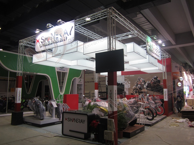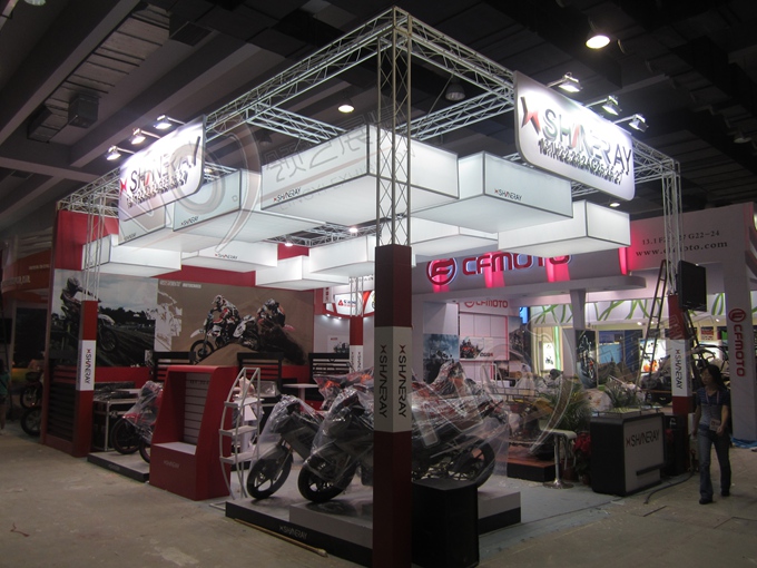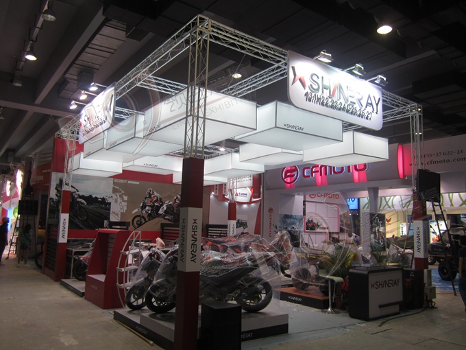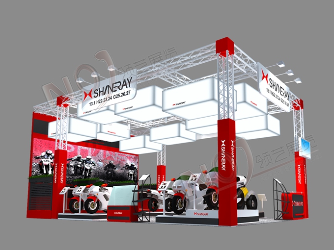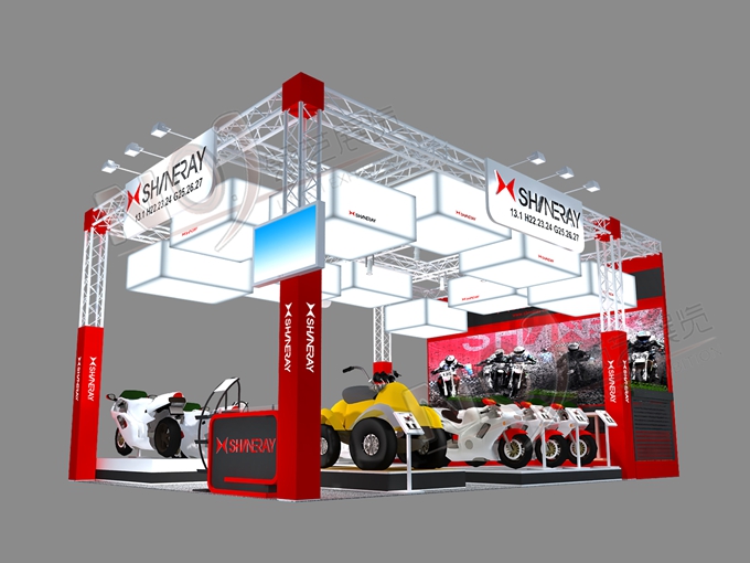 契合鑫源摩托的品牌形象和產(chǎn)品特性,采用矩形結(jié)構(gòu),再搭配燈具燈光的效果,襯托出展位簡(jiǎn)約、時(shí)尚的氛圍,突出一種現(xiàn)代、簡(jiǎn)約的時(shí)尚品味。