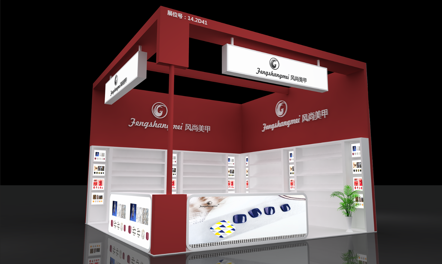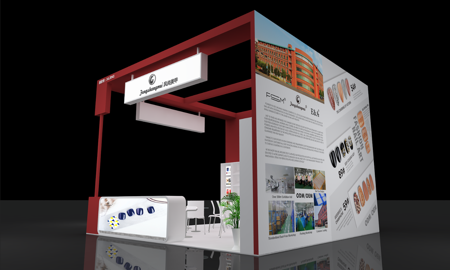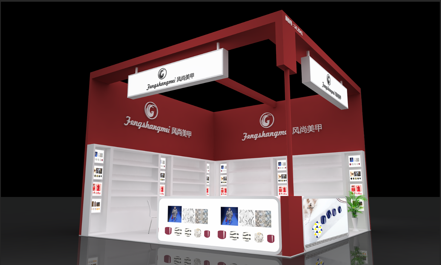 契合風(fēng)尚美甲的品牌形象和產(chǎn)品特性,采用矩形結(jié)構(gòu),再搭配燈具燈光的效果,襯托出展位大氣、豪華的氛圍,突出一種簡(jiǎn)約、時(shí)尚的品味。