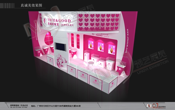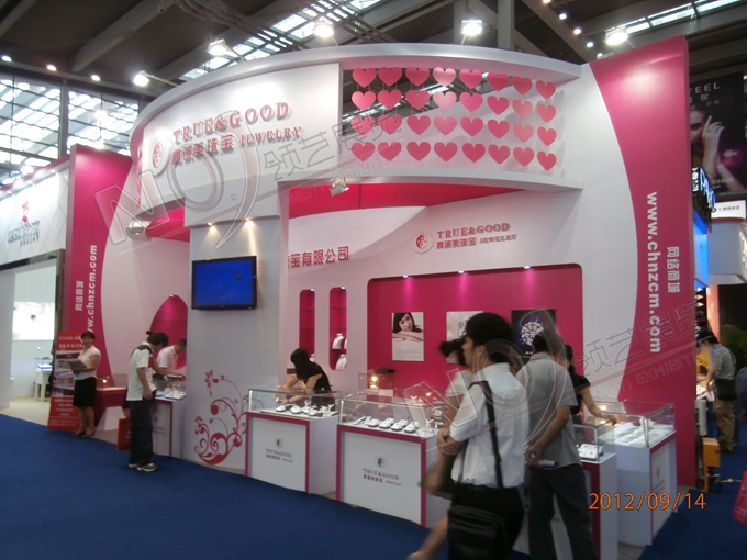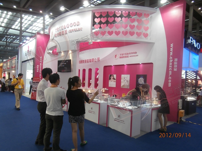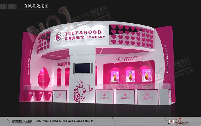 契合真誠(chéng)美珠寶的品牌形象和產(chǎn)品特性,以弧形結(jié)構(gòu)為主造型,再搭配燈具燈光的效果,襯托出展位絢麗、商務(wù)的氛圍,突出一種典雅、尊貴的時(shí)尚品味。