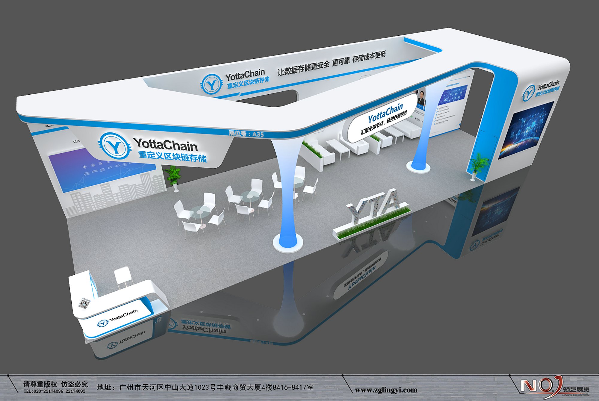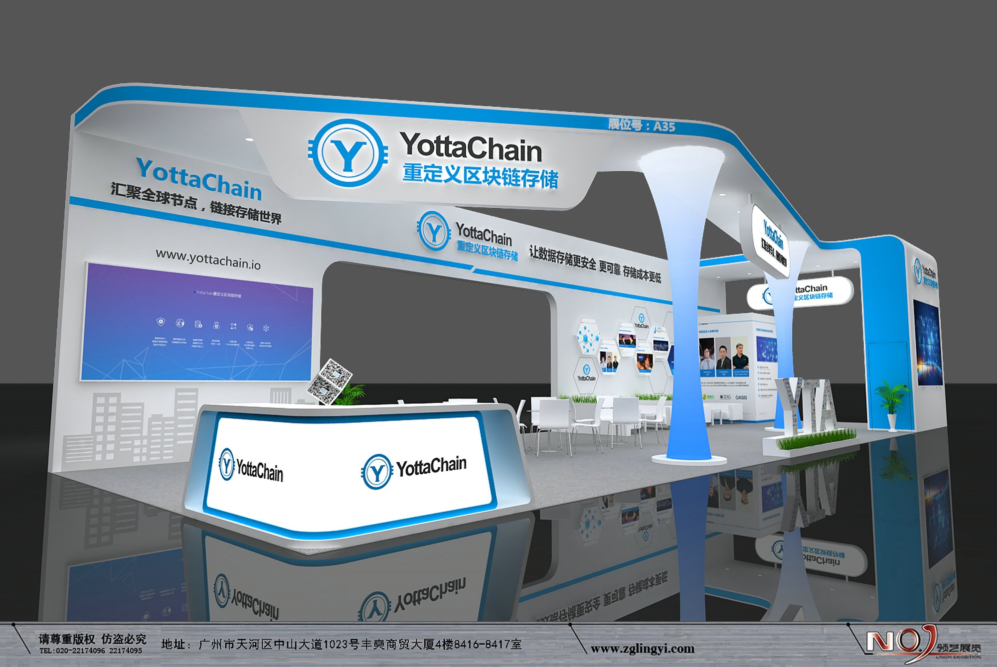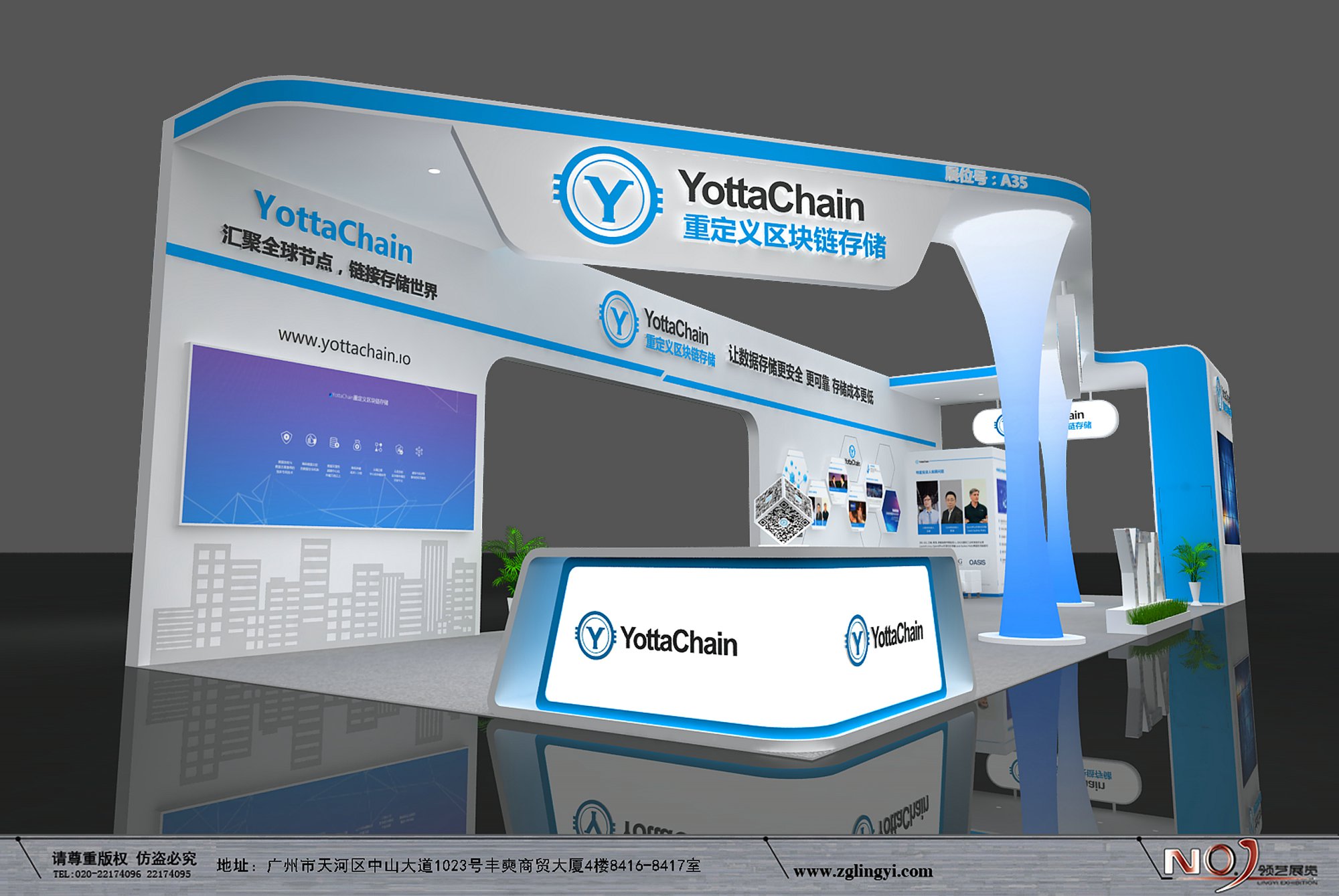 契合YottaChain的品牌形象和產(chǎn)品特性,采用開放式結(jié)構(gòu),再搭配燈具燈光的效果,襯托出展位大氣、豪華的氛圍,突出一種簡約、時尚的品味。