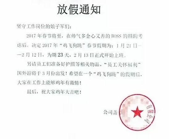 這兩天,重慶一家公司的春節(jié)放假通知在朋友圈火了。小編已經(jīng)無(wú)心碼字,直接看圖吧↓↓↓