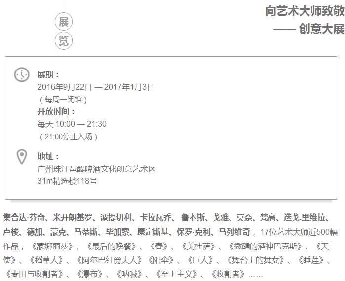 國內知名藝術家共同策展,以專業(yè)視角將歐洲14世紀文藝復興時期至當代17位全球最著名的藝術大師作品進行藝術凝練,以創(chuàng)意生動的動態(tài)解析方式傳遞國際藝術美學,走進藝術長河,一次看遍西方美術史。