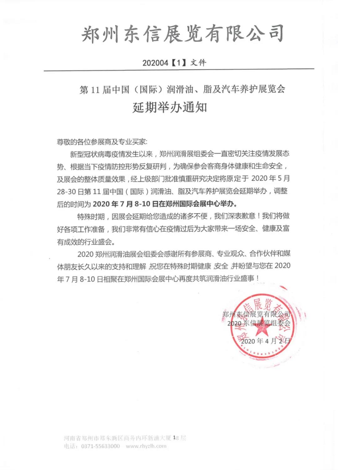 根據(jù)潤(rùn)滑油展設(shè)計(jì)搭建公司領(lǐng)藝展覽了解到,受新冠肺炎疫情影響,原定于2020年5月28-30日舉辦的第11屆中國(guó)潤(rùn)滑油、脂及汽車養(yǎng)護(hù)展覽會(huì)延期至2020年7月8-10日在鄭州國(guó)際會(huì)展中心舉辦。如需潤(rùn)滑油展設(shè)計(jì)請(qǐng)聯(lián)系領(lǐng)藝展覽,希望我們能在潤(rùn)滑油展搭建上為您添磚加瓦,祝各位朋友收獲多多,滿載而歸!