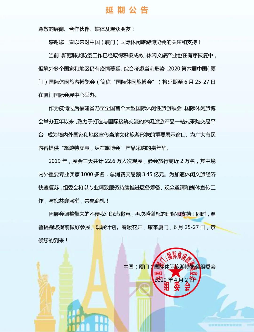 根據(jù)旅游展設(shè)計(jì)搭建公司領(lǐng)藝展覽了解到,2020第六屆中國(guó)(廈門)國(guó)際休閑旅游博覽會(huì)將延期至2020年6月25-27日舉行。如需旅游展設(shè)計(jì)請(qǐng)聯(lián)系領(lǐng)藝展覽,希望我們能在旅游展搭建上為您添磚加瓦,祝各位朋友收獲多多,滿載而歸!