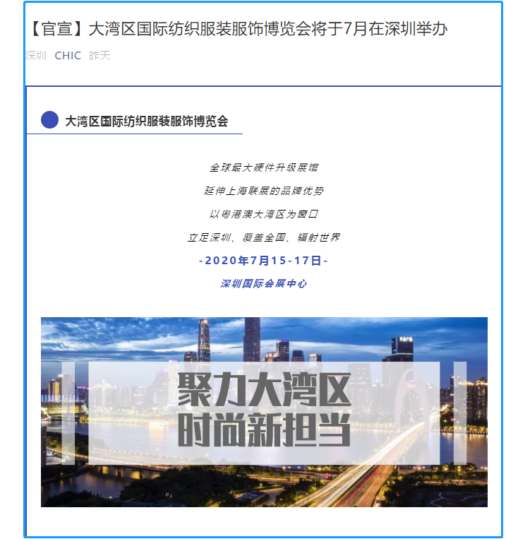 根據(jù)服裝展設(shè)計(jì)搭建公司領(lǐng)藝展覽了解到,中國紡織工業(yè)聯(lián)合會(huì)應(yīng)運(yùn)推出大灣區(qū)國際紡織服裝服飾博覽會(huì)(簡(jiǎn)稱“大灣區(qū)紡博會(huì)”),集結(jié)四大專業(yè)展會(huì)——大灣區(qū)國際紡織面料及輔料博覽會(huì)、大灣區(qū)國際服裝服飾博覽會(huì)、大灣區(qū)國際針織博覽會(huì)、大灣區(qū)國際紡織紗線博覽會(huì),將以近12萬平方米的展出規(guī)模,于2020年7月15日~17日亮相深圳國際會(huì)展中心。如需服裝展設(shè)計(jì)請(qǐng)聯(lián)系領(lǐng)藝展覽,希望我們能在服裝展搭建上為您添磚加瓦,祝各位朋友收獲多多,滿載而歸!