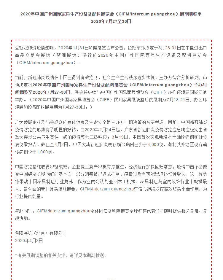 根據(jù)家具展設(shè)計(jì)搭建公司領(lǐng)藝展覽了解到,2020年中國(guó)廣州國(guó)際家具生產(chǎn)設(shè)備及配料展覽會(huì)(CIFM/interzum guangzhou)舉辦時(shí)間調(diào)整至2020年7月27-30日,展會(huì)將繼續(xù)與中國(guó)廣州國(guó)際家具博覽會(huì)(CIFF)辦公環(huán)境展同期同館舉辦。(2020年中國(guó)廣州國(guó)際家具博覽會(huì)(CIFF)民用家具展調(diào)整后的展期為7月18-21日;辦公環(huán)境展和設(shè)備配料展展期為7月27-30日。)如需家具展設(shè)計(jì)請(qǐng)聯(lián)系領(lǐng)藝展覽,希望我們能在家具展搭建上為您添磚加瓦,祝各位朋友收獲多多,滿載而歸!