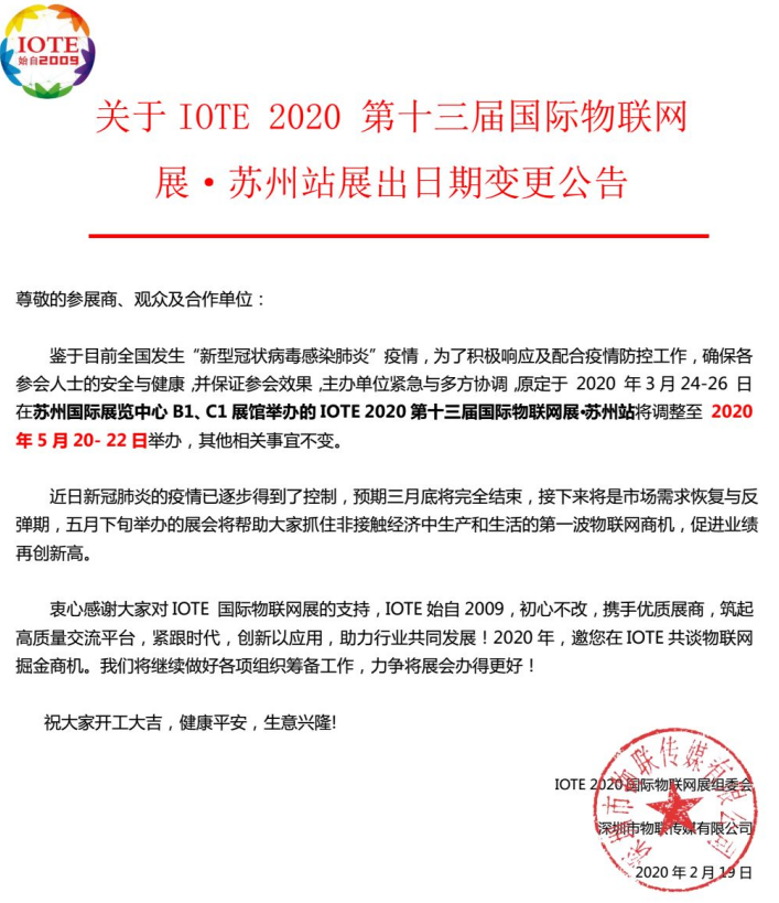 根據(jù)IOTE物聯(lián)網(wǎng)展設(shè)計(jì)搭建公司領(lǐng)藝展覽解到,鑒于目前全國(guó)發(fā)生“新型冠狀病毒感染肺炎”疫情,按照蘇州市人民政府《關(guān)于減少和取消大型公眾聚集性活動(dòng)的通告》要求,即日起,按照“非必須、不舉辦”的原則,在全市減少和取消大型公眾聚集性活動(dòng)。全力做好新型冠狀病毒感染肺炎疫情防控工作,為了響應(yīng)及配合疫情防控工作,確保各參展商及觀眾的健康安全,組委會(huì)決定將原定于2020年3月24-26日在蘇州國(guó)際展覽中心B1、C1展館舉辦的IOTE 2020第十三屆國(guó)際物聯(lián)網(wǎng)展·蘇州站將延期至5月20-22日舉辦。如需IOTE物聯(lián)網(wǎng)展設(shè)計(jì)請(qǐng)聯(lián)系領(lǐng)藝展覽,希望我們能在IOTE物聯(lián)網(wǎng)展搭建上為您添磚加瓦,祝各位朋友收獲多多,滿載而歸!