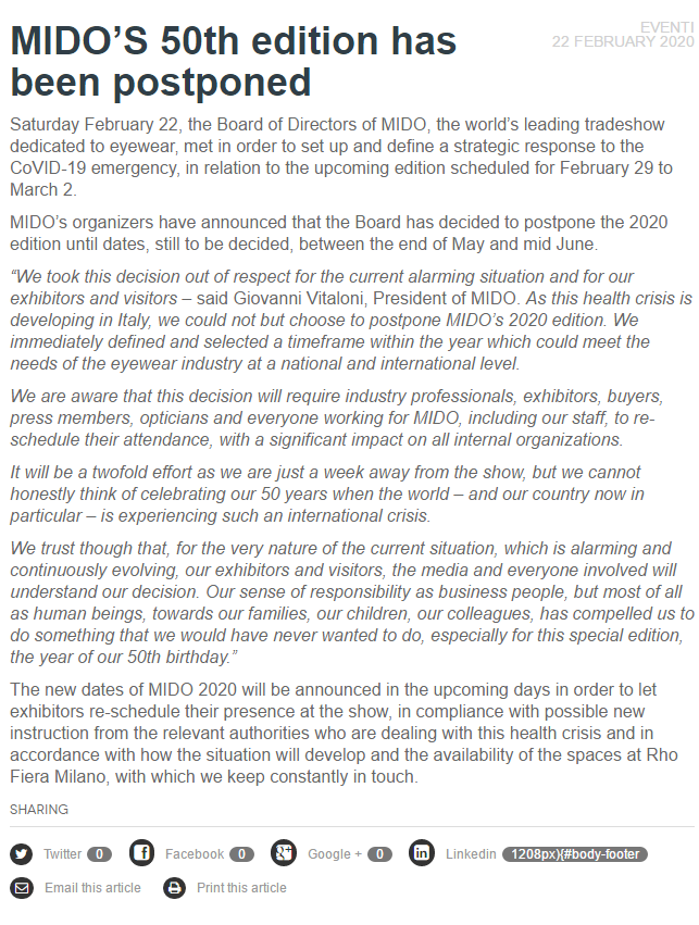 根據(jù)光學眼鏡展設計搭建公司領藝展覽了解到,全球規(guī)模最大的眼鏡專業(yè)展——米蘭國際光學眼鏡展主辦方宣布,鑒于疫情把每年一度的展會推遲到5月底至6月中旬,具體日期仍有待決定。如需光學展設計請聯(lián)系領藝展覽,希望我們能在眼鏡展搭建上為您添磚加瓦,祝各位朋友收獲多多,滿載而歸!