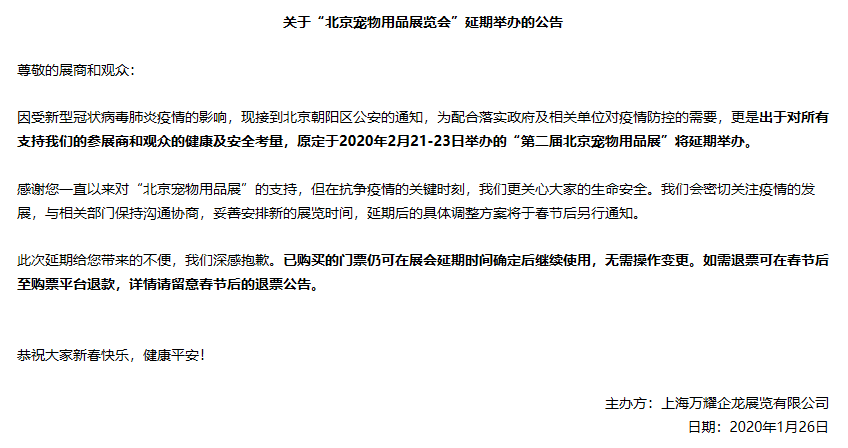 根據北京寵物展設計搭建公司領藝展覽了解到,因受新型冠狀病毒肺炎疫情的影響,主辦方為配合落實政府及相關單位對疫情防控的需要,更是出于對所有支持我們的參展商和觀眾的健康及安全考量,原定于2020年2月21-23日舉辦的“第二屆北京寵物用品展”將延期舉辦。如需北京寵物展設計請聯(lián)系領藝展覽,希望我們能在北京寵物展搭建上為您添磚加瓦,祝各位朋友收獲多多,滿載而歸!