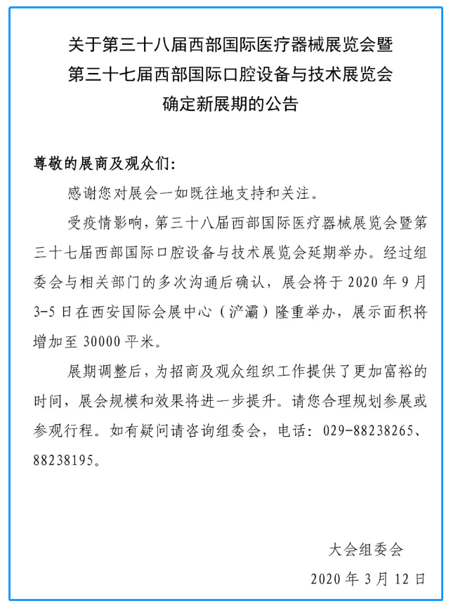 根據西部醫(yī)療展設計搭建公司領藝展覽了解到,受疫情影響,第三十八屆西部國際醫(yī)療器械展覽會調整至2020年9月3-5日在西安國際會展中心(浐灞)隆重舉辦。如需西部醫(yī)療展設計請聯系領藝展覽,希望我們能在西部醫(yī)療展搭建上為您添磚加瓦,祝各位朋友收獲多多,滿載而歸!