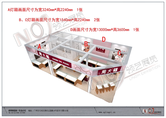 契合周大福的品牌形象和產(chǎn)品特性,采用矩形結(jié)構(gòu),再搭配燈具燈光的效果,襯托出展位高端、時尚的氛圍,突出一種現(xiàn)代、歐美的時尚品味。