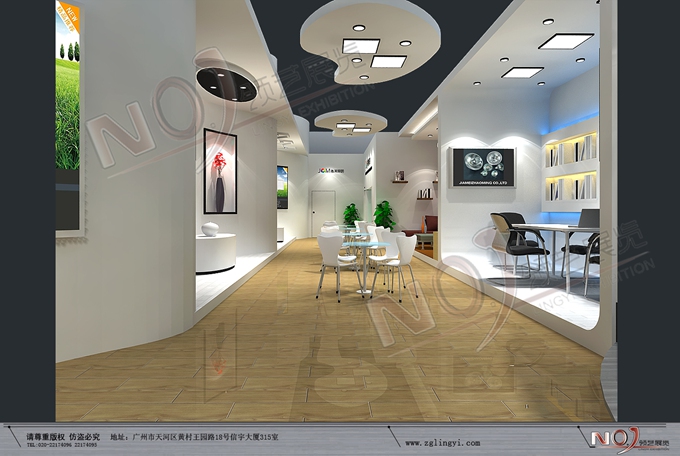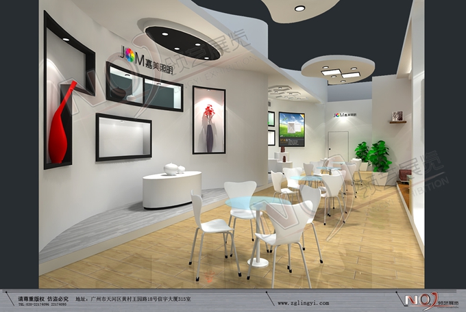 契合嘉美的品牌形象和產品特性,采用弧形、矩形結構,再搭配燈具燈光的效果,襯托出展位時尚、簡約的氛圍,突出一種現(xiàn)代、活力的時尚品味。