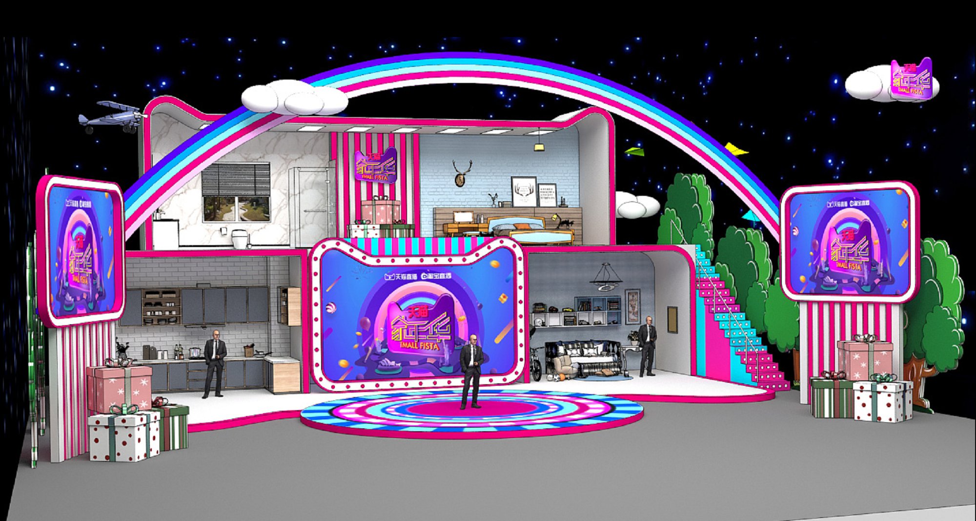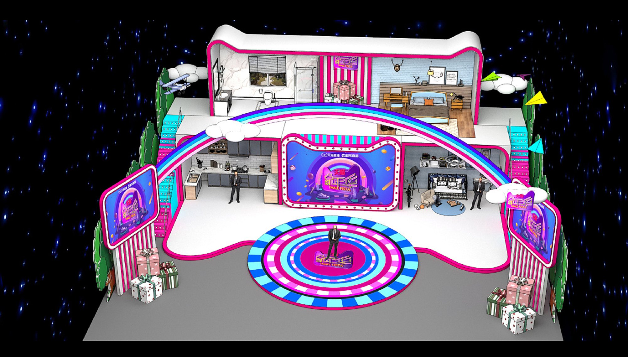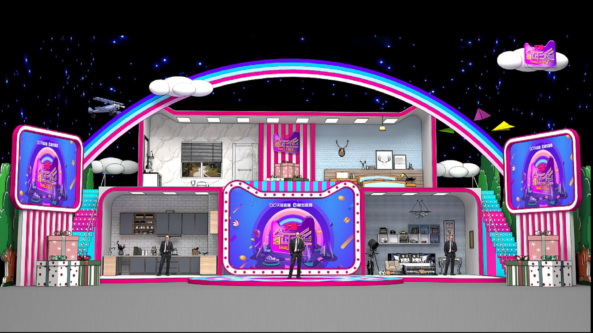 契合天貓的品牌形象和產(chǎn)品特性,采用開放式結(jié)構(gòu),再搭配燈具燈光的效果,襯托出直播間大氣、豪華的氛圍,突出一種簡(jiǎn)約、時(shí)尚的品味。